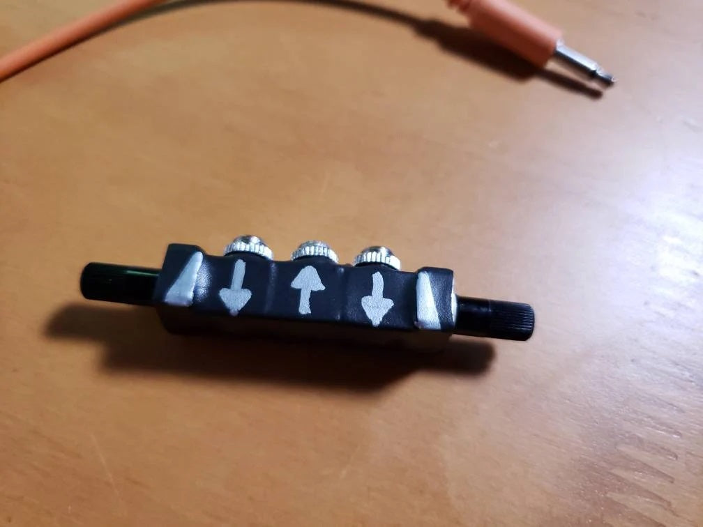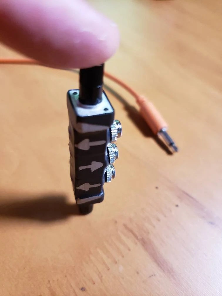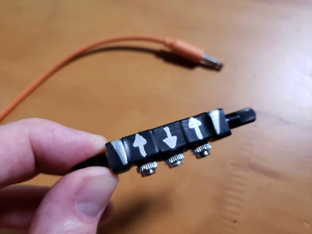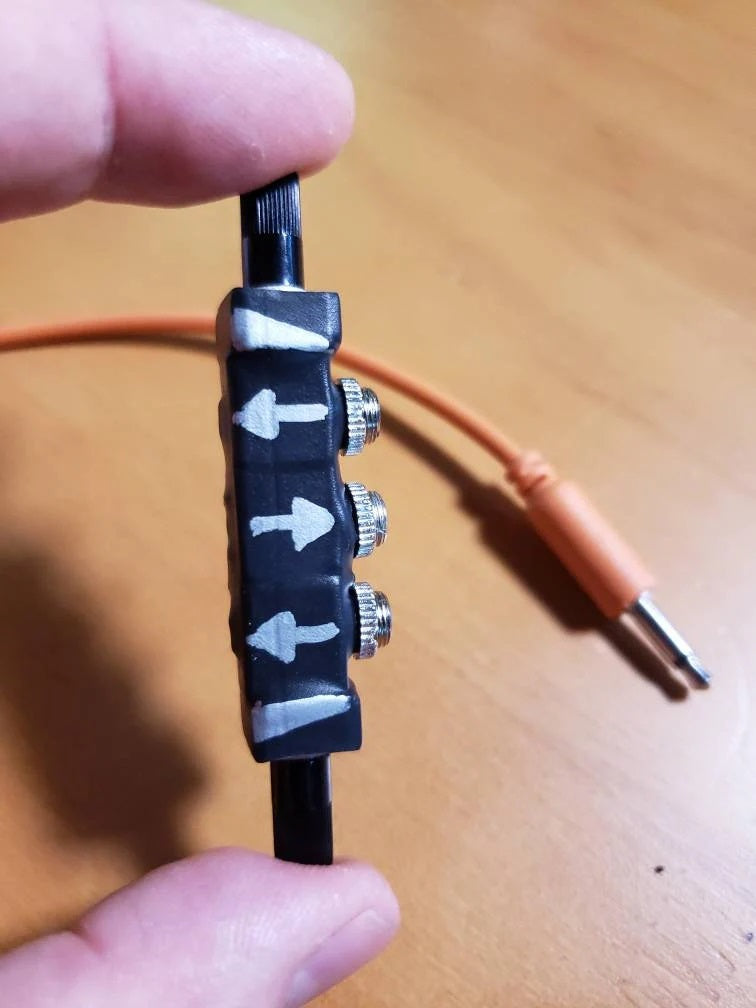 Volume knobs are placed on each end and controlled by twisting them forward to increase volume, or back to decrease. Center jack is the output while the jacks on either side are inputs with corresponding knobs (arrows on mixer indicate signal flow).