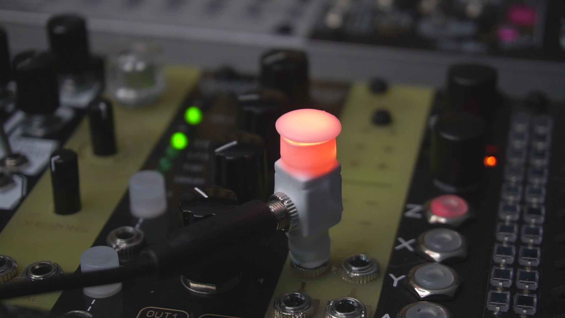 Each light indicates an oscillator, all four oscillators loop a pattern of tones and clicks that de-sync over time, turning into an unpredictable CV source. The module begins functioning around 3v when LEDs start to glow red and you get sparse clicks and tones, as CV increases you get more clicks and tones, higher cv output, as well as more colors out of the LEDs. When voltage is dropped below about 3v, all four oscillators reset and are back in sync until they fall back out of sync over time.
